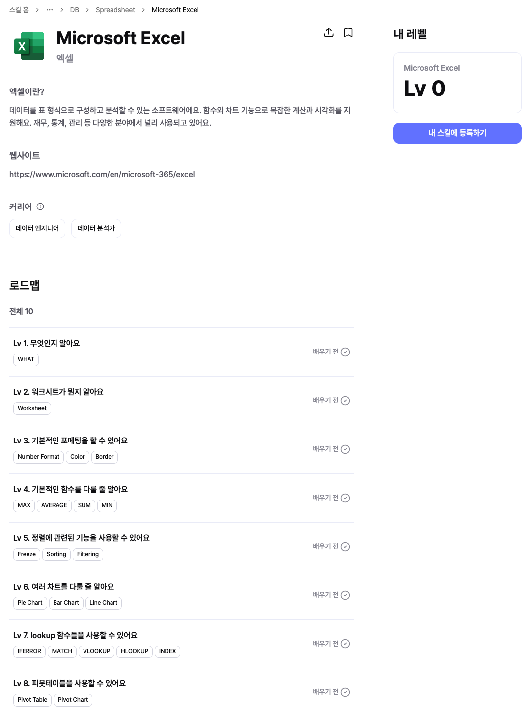 Excel로 분석 업무를 해보고 싶은데, 어디서부터 시작해야 할지 막막하지 않으신가요? 이제 첫걸음을 떼는 여러분을 위해, 단계별로 쉽게 따라갈 수 있는 트리업 엑셀 로드맵을 소개할게요! 트리업에는 스킬마다 로드맵이 주어져요. 내가 어느 레벨에 해당하는지 하위 주제를 통해 알 수 있고 다음 단계로 어떻게 갈 수 있는지 빠르게 확인할 수 있어요.