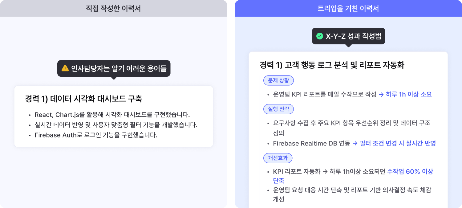 초봉 5천 이상 IT 스타트업의 CTO나 시니어 개발자는 “A 기술을 쓸 줄 안다”보다는 한 프로젝트에서 어떤 문제를 해결했는지를 중시하는 것 같았어요. 여기서 크게 트리업에서 제공하는 X-Y-Z 성과 구조가 정말 큰 도움이 됐는데요.